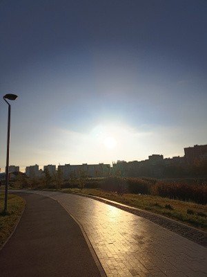 Выбежала поздно, когда уже посветлело. Даже солнышко пригревало. Небольшой едва заметный ветерок создавал сопротивление. Поставила цель бежать медленно, чтобы не превышать ЧСС 160 (с для по данным трекера, не удалось). Ощущение было, что стою на а месте и просто поднимаю ноги (первый км в наушник трекер озвучил скорость 8 мин (!), понятно, почему такие ощущения). Плелась как могла, ЧСС стал подскакивать. Но решила в выходной никуда не спешить и плестись. Первое "второе" дыхание открылось после 7 км, второе "второе" дыхание и просветление в голове случилось после 9 км, хотелось так и трусить, и трусить без остановки дальше. Даже была грешная мысль ещё 10ку пробежать (получился бы ПМ :)))