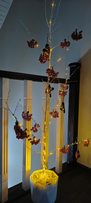 Дерево - это ветка от какого то небольшого деревца, по моему рябины. Покрыта краской, потом эту ветку я в гипсе в кашпо загипсовала, ну а снегири шила сама из фетра. Ягодки рябины и гирлянда покупные ). У такая красота радует уже лет 5 на даче.